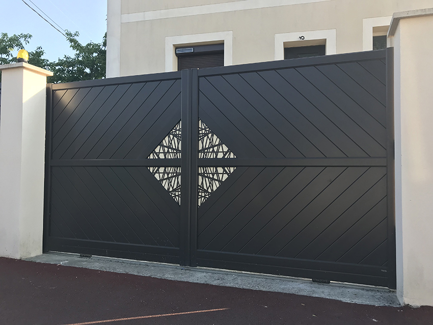 portail Diferbat Lincoln Ral 8019 SMF, forme droite, tôle arrière(option) derrière le décor découpe laser bambou